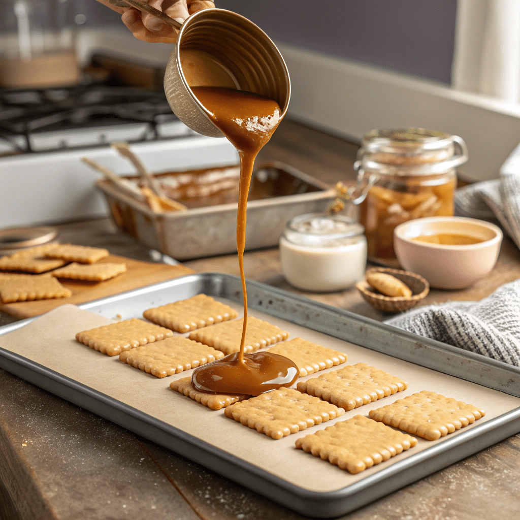 - Pour over crackers: Immediately pour the hot caramel over the crackers and spread evenly with a spatula.