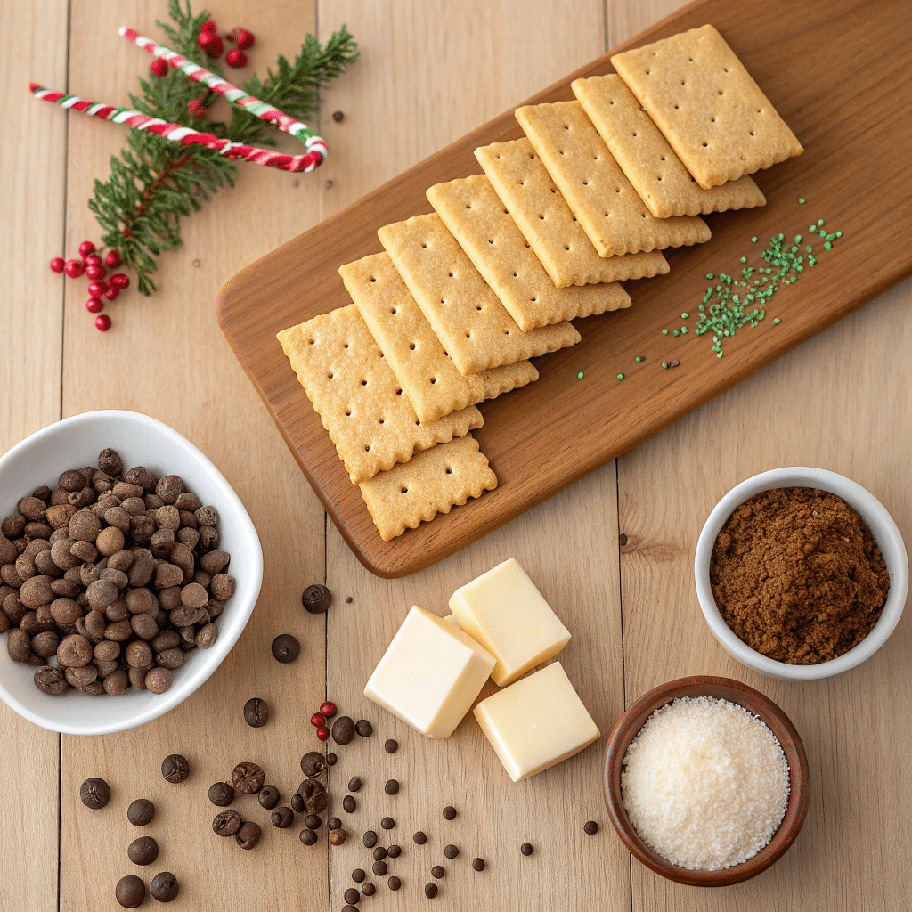 It’s made with saltine crackers, butter, brown sugar, and chocolate chips. Once baked and set, it becomes a crisp, chewy candy bark with festive toppings.