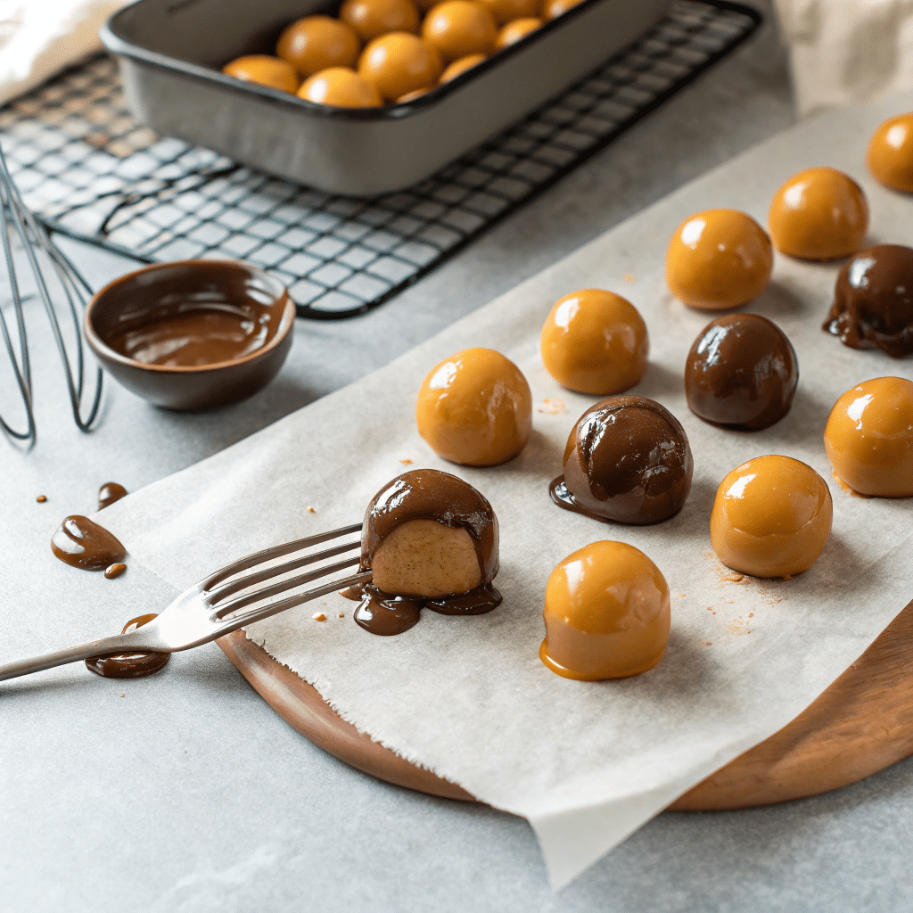 - Dip the truffles: Using a fork or skewer, dip each caramel ball into the chocolate, letting excess drip off.