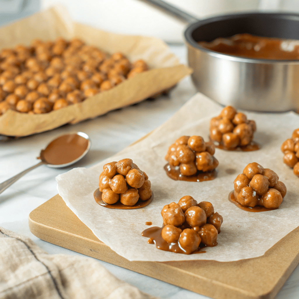 - Form clusters: Line a baking sheet with parchment paper. Drop spoonfuls of the caramel-peanut mixture onto the tray, forming small mounds. Chill for 10–15 minutes until firm.