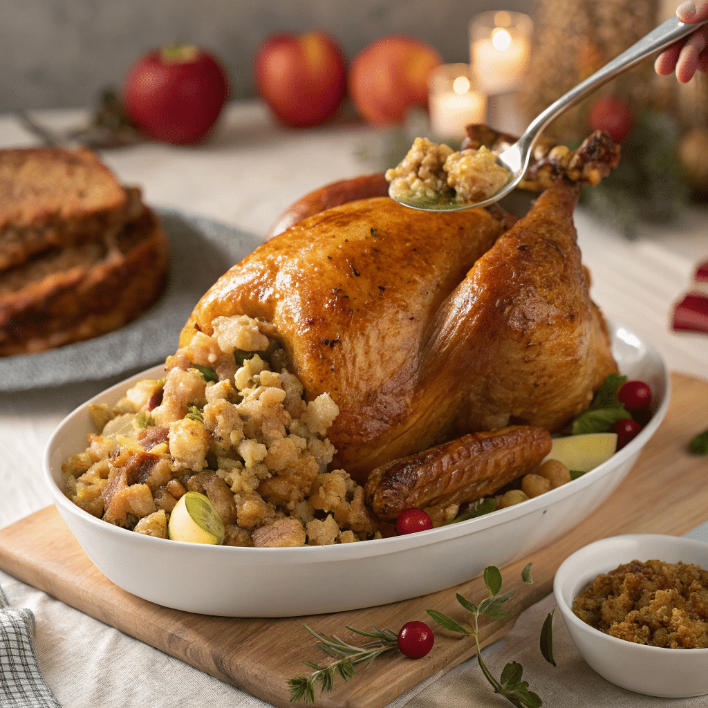 Always loosely stuff turkey so it cooks evenly. Make extra stuffing in a separate dish for larger gatherings. Baste turkey regularly for a golden, crisp finish. Let turkey rest before carving to keep juices inside.