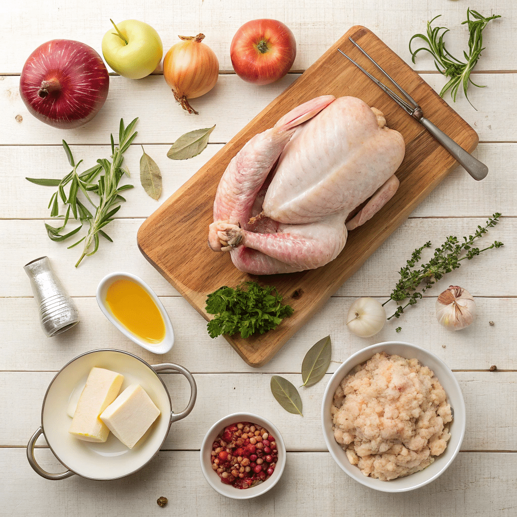 Preheat oven to 325°F (165°C). In a skillet, melt butter and sauté onion, garlic, and apples until softened. Add sausage and cook until browned, breaking it into crumbles. Stir in breadcrumbs, broth, parsley, sage, thyme, rosemary, salt, and pepper. Let stuffing cool slightly. Pat turkey dry, season inside and out, and loosely stuff the cavity with sausage-apple mixture. Place turkey on roasting rack in pan, pour broth around it, and roast for about 15 minutes per pound, basting occasionally. Cover with foil if skin browns too quickly. Turkey is done when internal temperature reaches 165°F. Rest 20 minutes before carving.