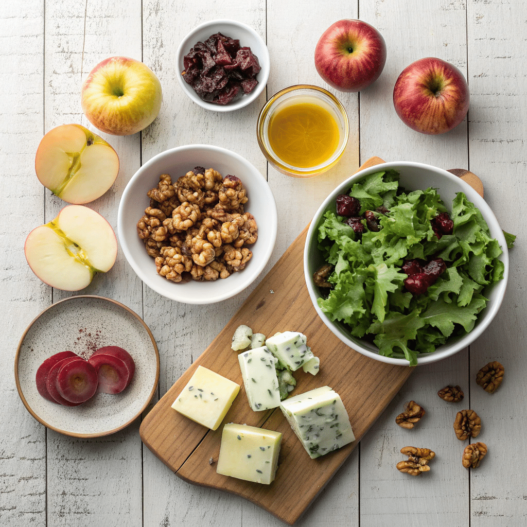 2. In a large salad bowl, combine mixed greens, apple slices, walnuts, cranberries, and red onion.